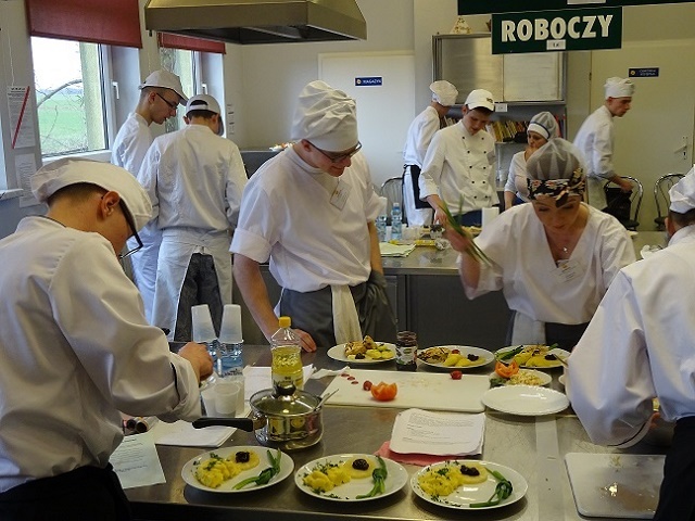Część praktyczna obejmowała przygotowanie zestawu obiadowego składającego się z faszerowanej piersi drobiowej, surówki Colesław oraz ziemniaków z wody z koperkiem. Do pracy w komisji oceniającej zaproszono nauczycieli – fachowców od żywienia. Dzięki uprzejmości Pana Ryszarda Pawłowskiego – Dyrektora Zespołu Szkół Zawodowych im. Stanisława Staszica w Ząbkowicach Śl. zmagania konkursowe oceniały nauczycielki przedmiotów gastronomicznych Panie Julita Pikul i Beata Delikat.